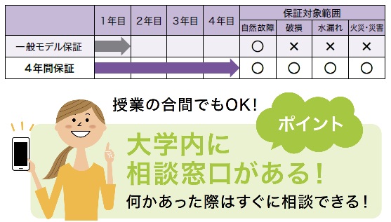 パソコンは精密機器のため、正しい使い方をしていても突然の故障や、飲み物こぼし・液晶割れ等の事故による故障が起こってしまうことがあります。福山市立大生協でご購入いただいた場合は、心の『4年間メーカー保証+4年間の動産保証付き』をご用意しています。