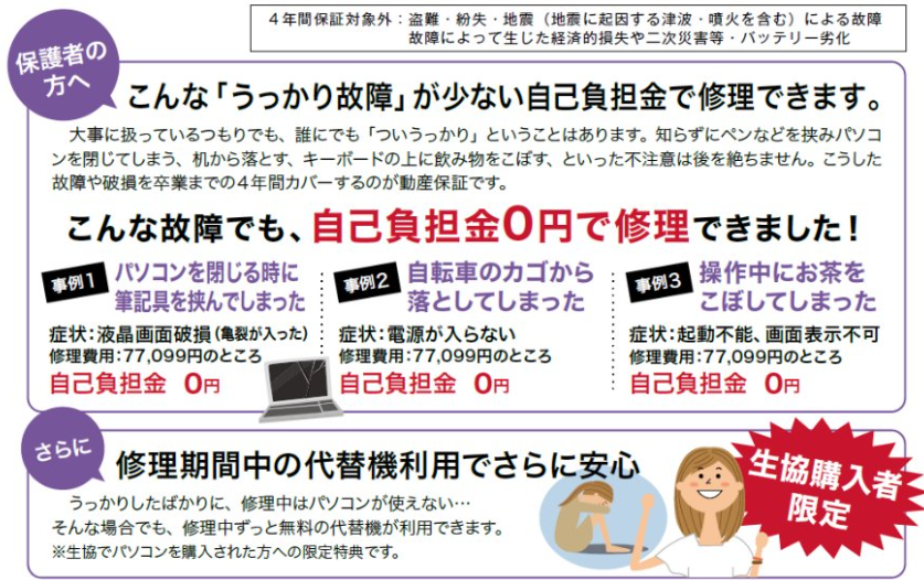 - 4年間保証は、生協が提案する大学推奨パソコンのオプション品です。他店で購入のパソコンには適応できません。
