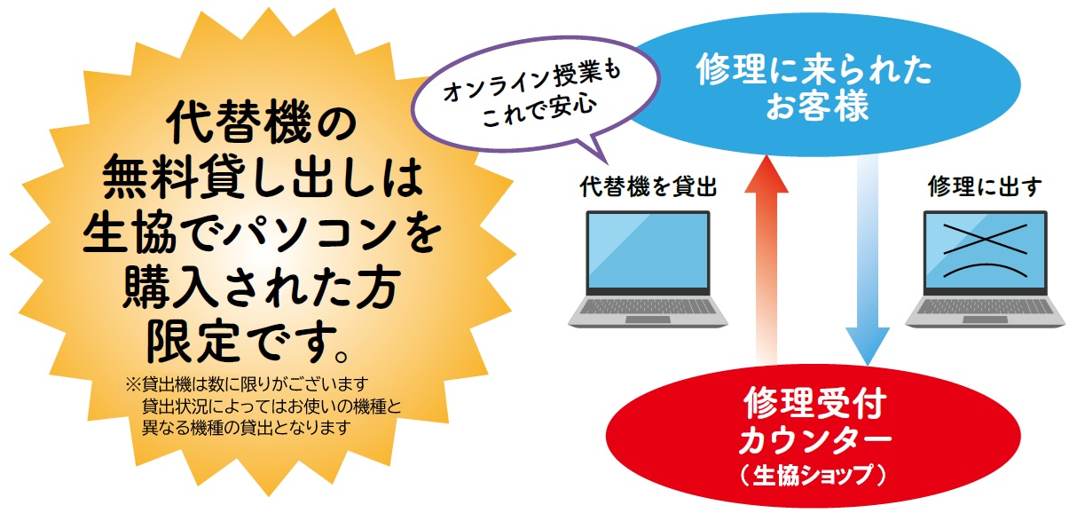 修理が必要な場合も、生協ショップに持ち込めば、その場でお預かり、修理申し込みの代行も受付可能なので、学内ですべて完結!