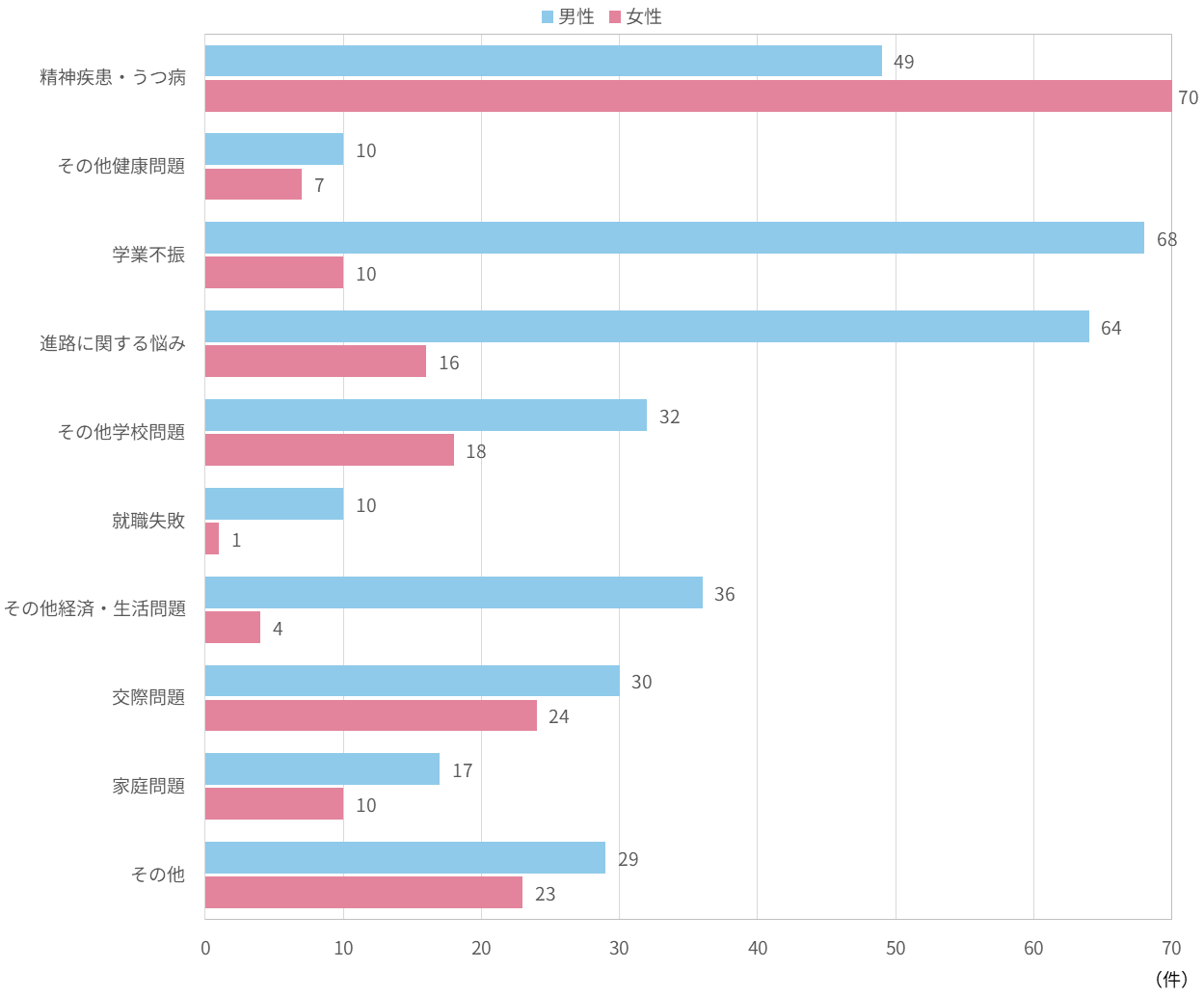 | 学業の問題(進路等含む) | 128件 | 14.2% | 18件 | 10件 | 12件 | 39件 | 48件 | 1件 |