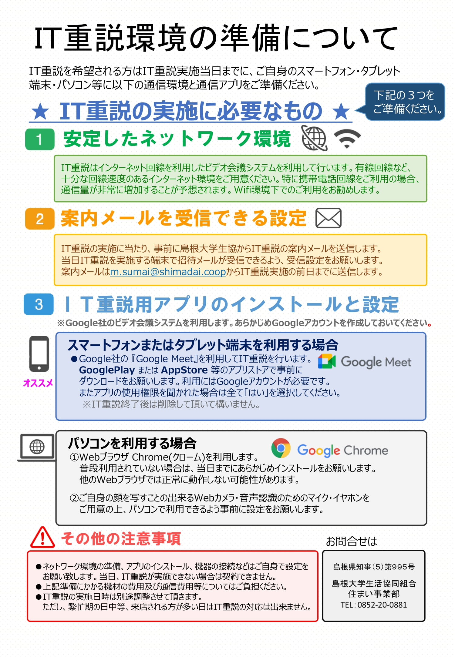 このような状況でお困りの方は、島根大学生協でのお部屋探しとIT重説をご検討ください。島根大学生協では、 今まで対面でしかできなかった重要事項説明を、 一定の条件を満たしていれば、ご自宅に居ながら パソコンやスマホのテレビ通話システムで聞く ことができます。
