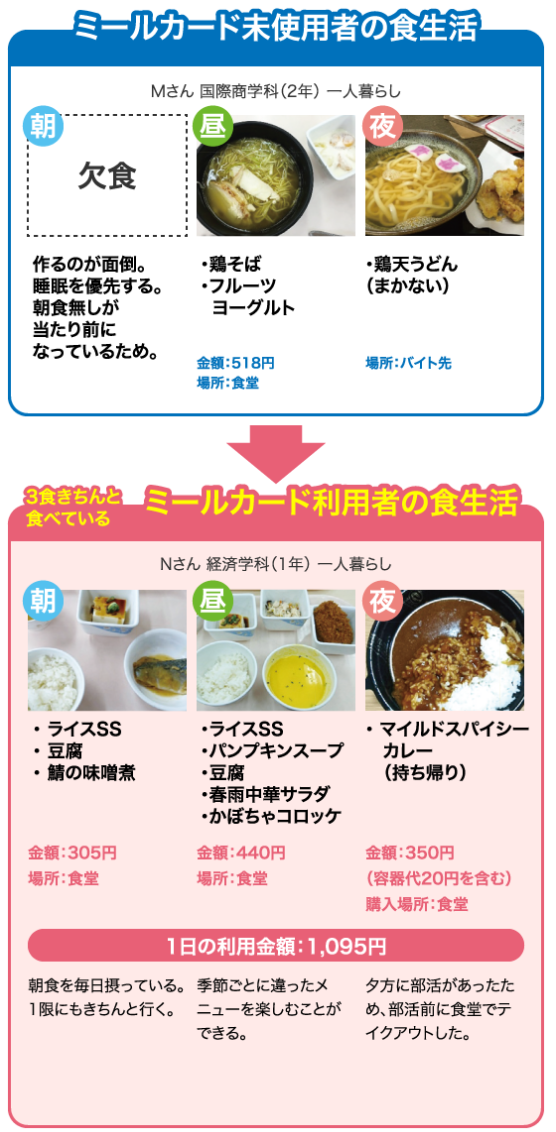 ミールカードは生協食堂の年間利用定期券です。1日の上限金額まで何度 でもご利用いただけます。そのため、急な出費があっても食費を削る必要 はありません。下宿生用は朝食(10時までのご利用)利用で最大1,600 円なので、しっかりと3食を食べることができます。保護者の方からして もミールカードをご購入いただくことで、仕送りが確実に食費へつながり ます。
