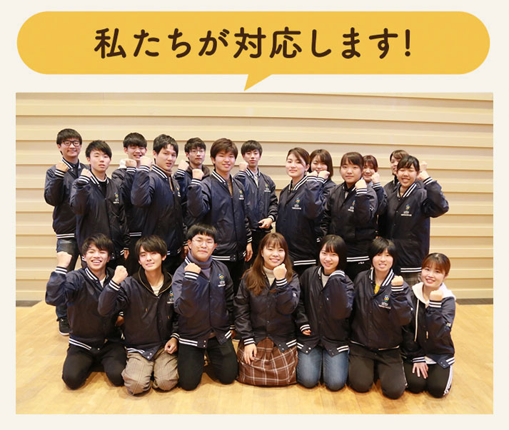 新入生サポートセンターでは、学生スタッフが下関市立大学の先輩として新入生・保護者の方をしっかりとサ ポートしながら、これらのことをいっしょに解決していきます。