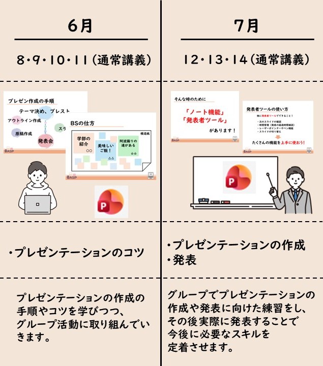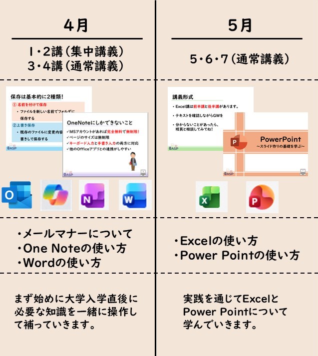 また、徳島大学生協では生成AIを効率的な学習の実現のために用いるべきだと考えており、PC総合セミナーでは、新入生の皆さんに大学生には必須ともいえる電子ノートの取り方やスライドの作り方、メールの書き方、生成AIを用いるうえでの小技などを学んでいただき、カッコ良く使いこなせる徳島大学生になるためのお手伝いをしています。