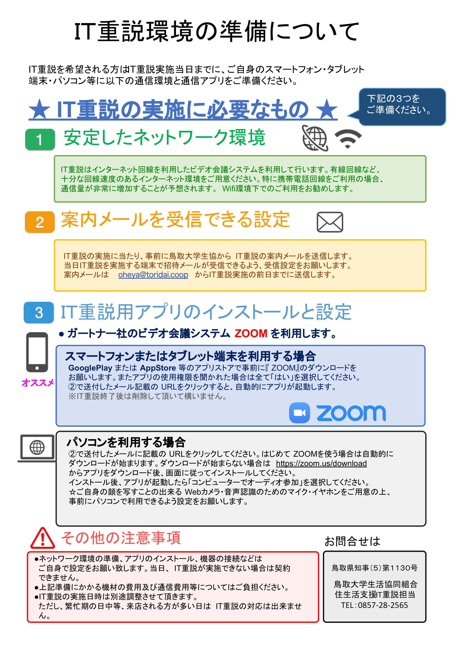 このような状況でお困りの方は、鳥取大学生協でのお部屋探しとIT重説をご検討ください。不動産取引の際には、宅地建物取引士による重要事項の説明(重説)が義務付けられていますが、一定の条件を満たしていれば、自宅に居ながらパソコンやスマホのビデオ通話システムを活用したIT重説により重要事項の説明を受けることができます。さらに電子契約ならば面倒な署名・捺印、郵送のやり取りもせずオンライン上で手続きを完了することが可能です。