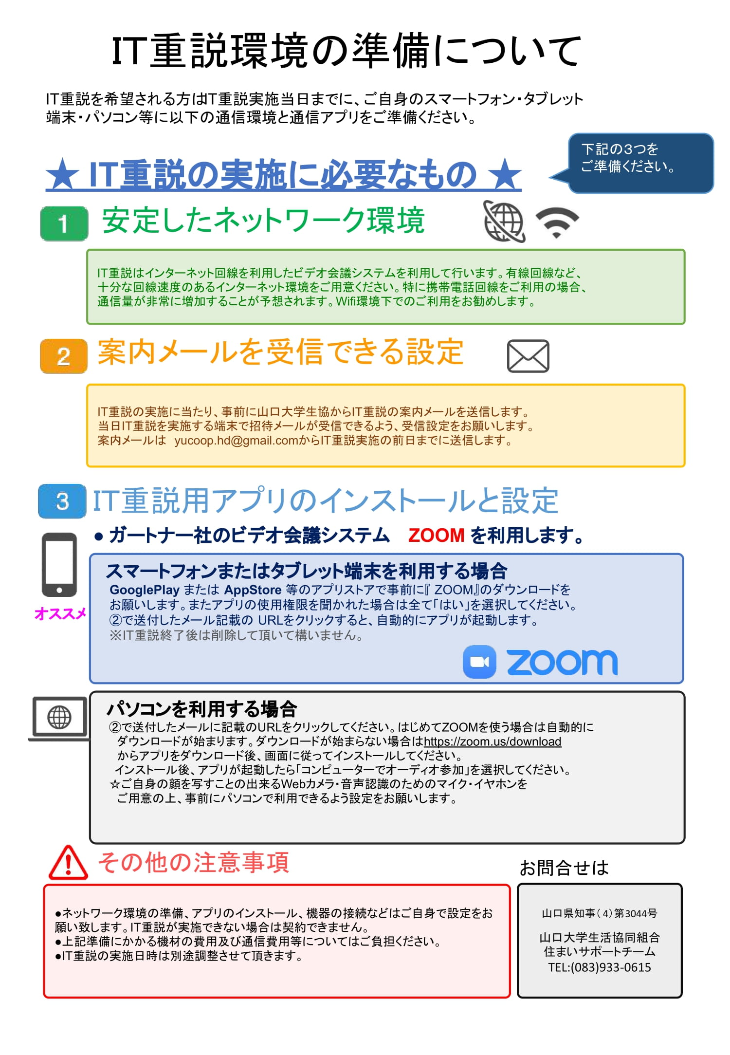 このような状況でお困りの方は、山口大学生協でのお部屋探しとIT重説をご検討ください。不動産取引の際には、宅地建物取引士による重要事項の説明(重説)が義務付けられていますが、一定の条件を満たしていれば、自宅に居ながらパソコンやスマホのビデオ通話システムを活用したIT重説により重要事項の説明を受けることができます。さらに電子契約ならば面倒な署名・捺印、郵送のやり取りもせずオンライン上で手続きを完了することが可能です。