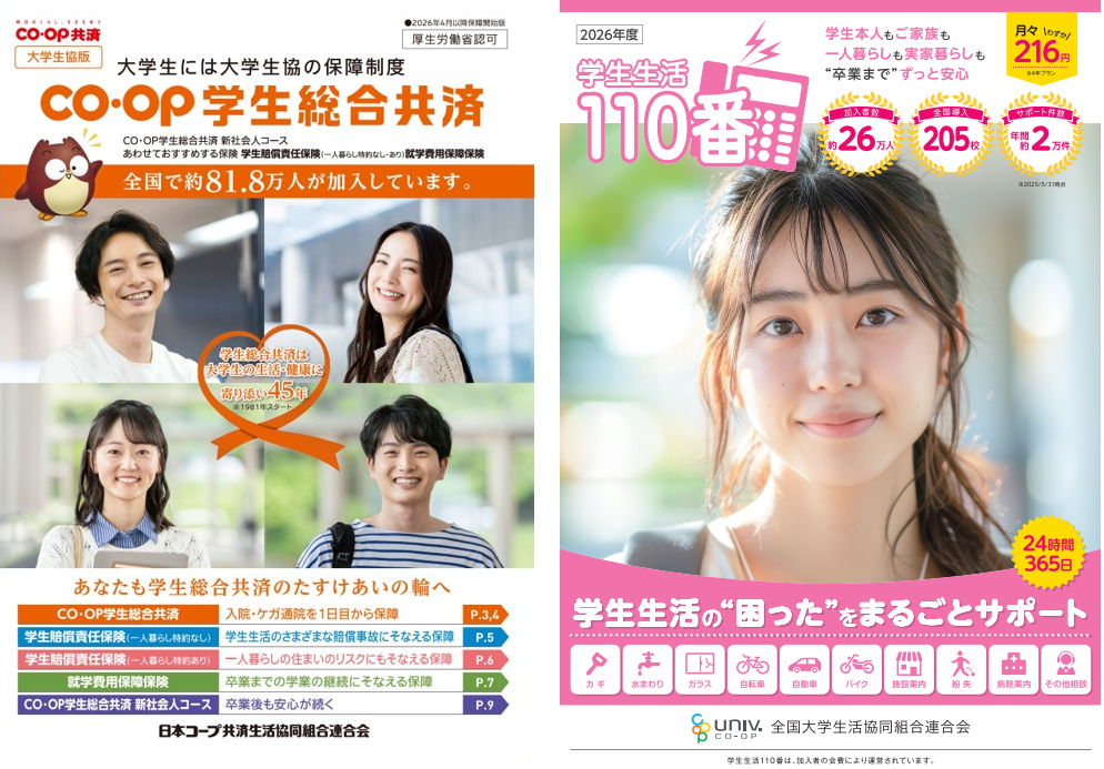 このご案内は学生総合共済、学生賠償責任保険、就学費用保障保険の概要を説明したものです。ご加入の際は『CO・OP学生総合共済』パンフレット記載の保障内容、重要事項説明書および制度のあらましを必ずご一読ください。ご不明点があれば、パンフレット記載のお問い合わせ先までご連絡ください。